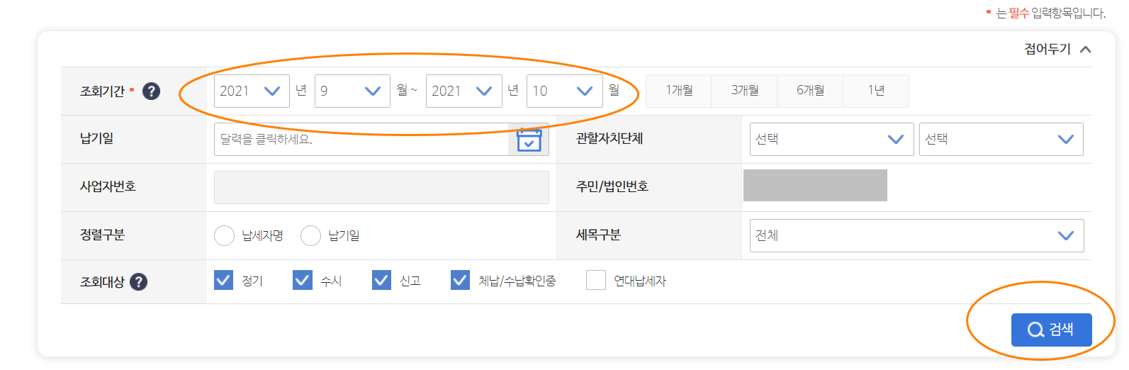 3. 조회기간(필수, 나머지 항목은 선택)을 선택한 후 검색을 눌러주세요. 그럼 아래 검색결과가 표시되며 금액, 납기일, 전자납부번호 등을 확인할 수 있습니다.